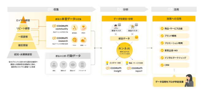 「coorum」は、顧客の本音データとAIを起点に、あらゆるCXを改善するために生み出されたAsobica独自のプラットフォーム。思い込みによる事業成長の機会逸失を防ぎ、確実な事業成果につなげるステップを総合的に支援する。